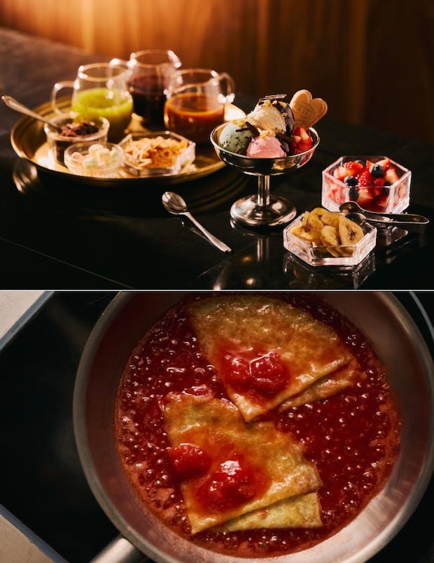 また、ライブキッチンでゲストの目の前で仕上げられる「クレープシュゼット」も見逃せない。パーティ気分が高まる甘く香ばしい香りと、できたての味わいを存分に堪能しよう。
