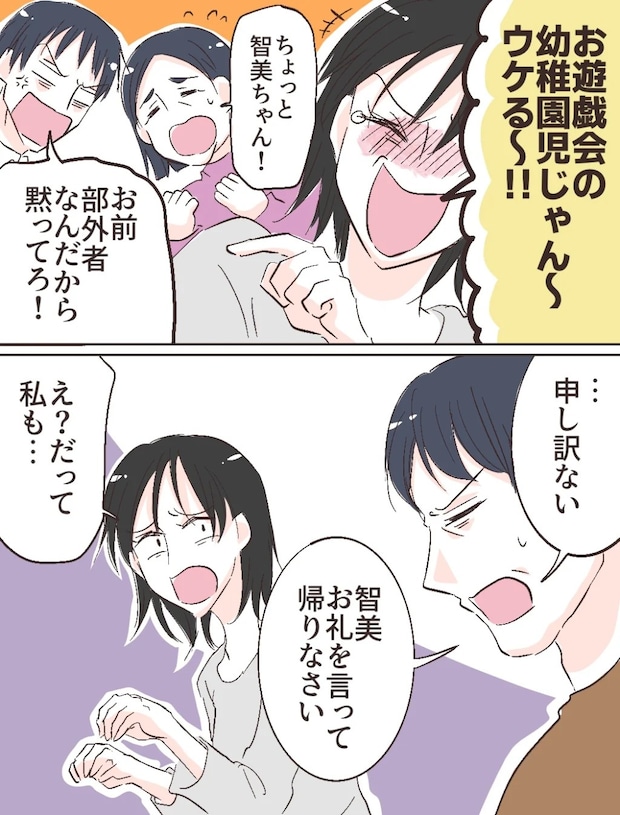 「お遊戯会の幼稚園児じゃん~ウケる~!!」と所構わず大笑いする智美さんを見て、「ちょっと智美ちゃん!」と慌てる義母。「お前部外者なんだから黙ってろ!」修吾も怒り出しました。すると、「・・申し訳ない。智美、お礼を言って帰りなさい」義父が智美さんに帰るよう促すと、「え?だって私も・・」と驚く智美さんに、
