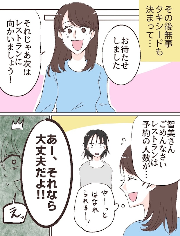 その後、無事タキシードも決まり、「お待たせしました。それじゃあ次はレストランに向かいましょう!」とみんなに声を掛けつつ、「智美さん、ごめんなさい。レストランは予約の人数が・・」そう言いながら「やーっとはなれられるー!」と心の中で大喜びする私。すると、「あー、それなら大丈夫だよ!!」と声が聞こえてびっくり。