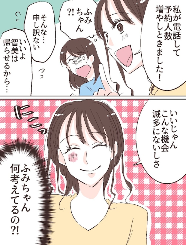 「私が電話して予約人数増やしておきました!」平然と言うふみのを見て、「ふみちゃん!?」と意味が分からない私。義母や義父が「そんな・・申し訳ない」「いいよ。智美は帰らせるから・・」と口々に言うと、「いいじゃん。こんな機会滅多にないしさ」そう言ってにっこり笑うふみのを見て、「ふみちゃん何考えてるの!?」と動揺しました。