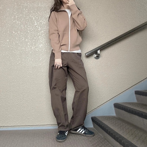 ベージュのミラノリブフルジップカーディガンにブラウンのパンツと、ワントーンでまとめた@ayamiii.y.mさん。カーディガンの下にホワイトのロンTを仕込むことで、顔まわりが明るくなり、ぼやけがちなブラウンコーデにコントラストと抜け感をプラスしています。