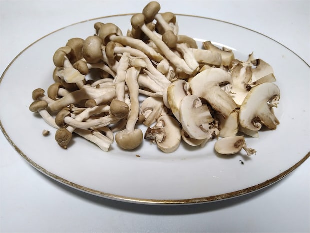 2. しめじは手でほぐして、マッシュルームは薄切りにする。