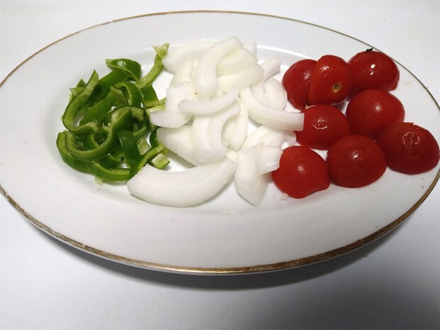 1. ピーマンは1cm幅に切り、玉ねぎは薄切り、ミニトマトはヘタを取って半分に切る。