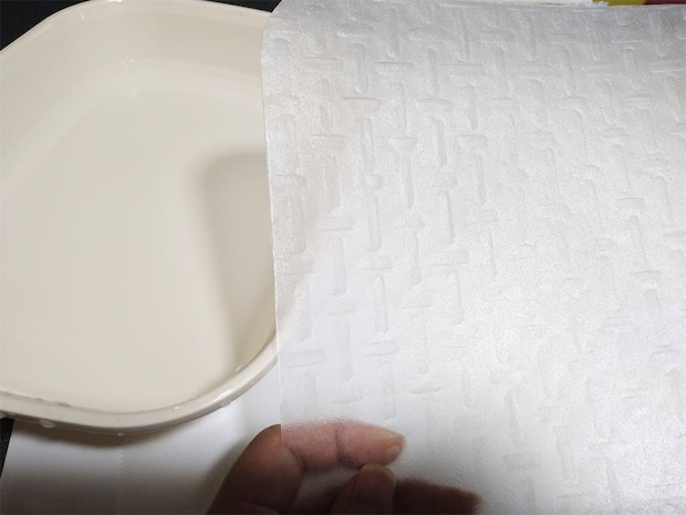 40℃程度のぬるま湯もしくは、水に20~30秒程度1枚ずつ浸します。柔らかくなってきたら引き上げます。