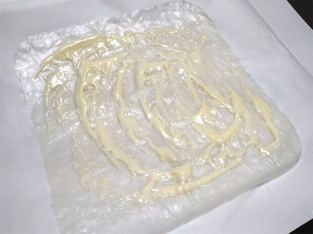2. 水で戻したライスペーパーに、マヨネーズを薄く塗る。