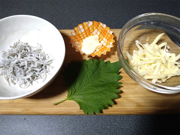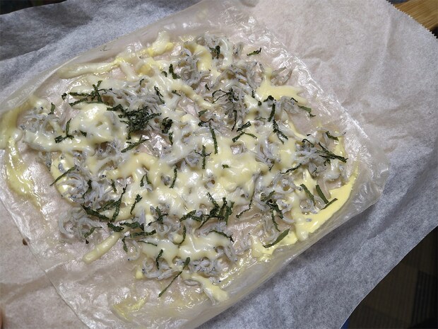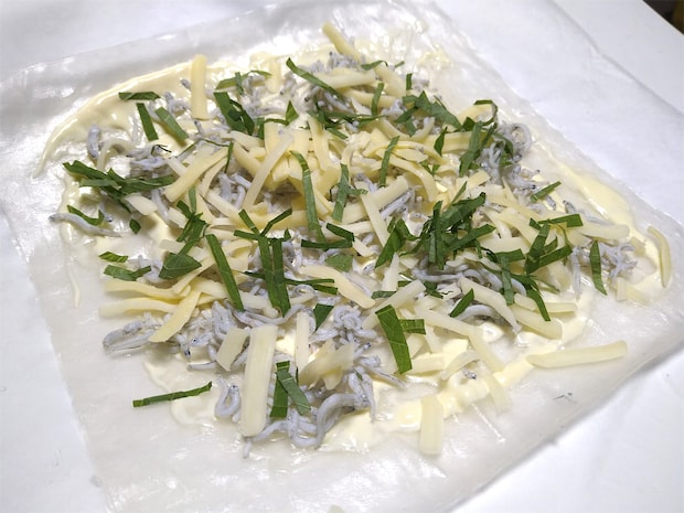 3. その上にちりめんじゃこ、チーズ、青じそを散らして、オーブントースターで7分程度焼く。