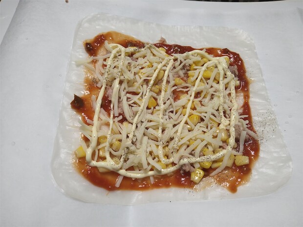 4. 水で戻したライスペーパーにピザソースを塗って、具材をのせる。お好みの量のチーズをかけて、オーブントースターで7分程度焼く。