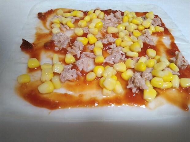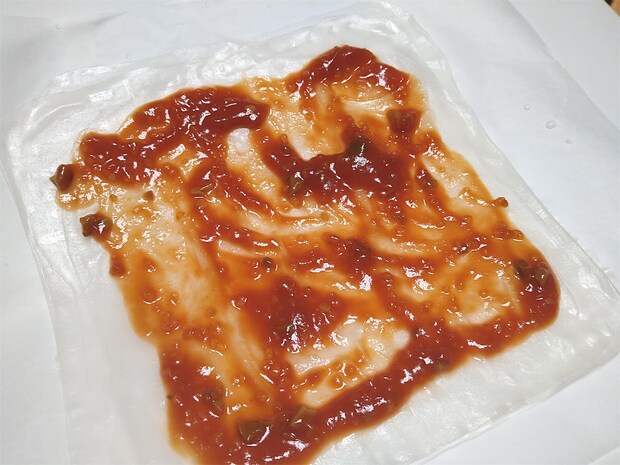 1. 水で戻したライスペーパーに、ピザソースを塗る。