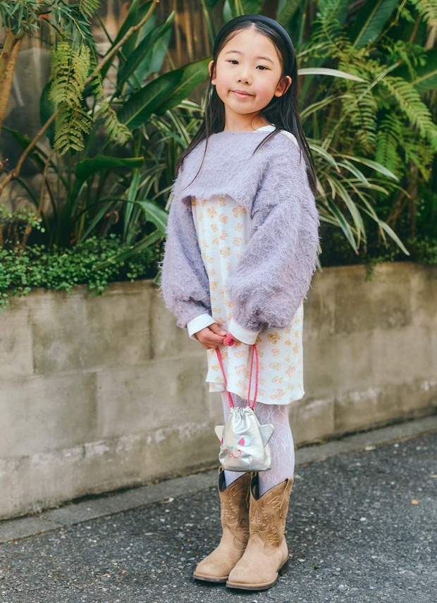 シルバーのネコモチーフバッグは『カルディ』で購入。ピンクの紐が好アクセントに、キッズの「好き」が詰まったアイテム。
