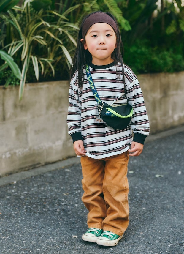 『コンバース』のスニーカーは鮮やかなグリーンをチョイス。キャメルカラーのボトムスとのコントラストが新鮮♪