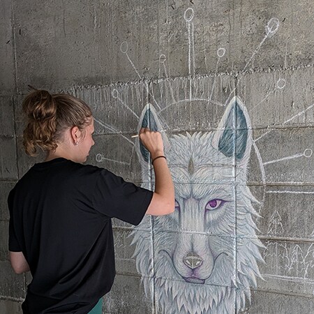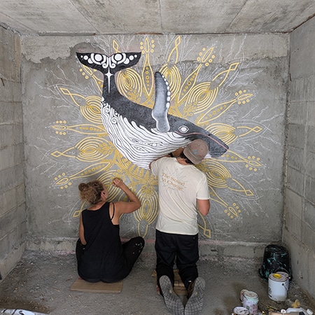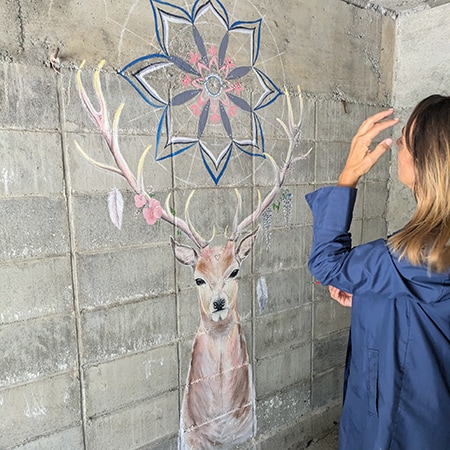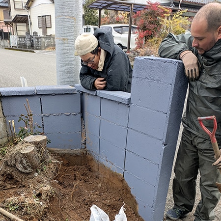 彼らが「一軒宿あせみ」のブロック塀に壁画を描いている。