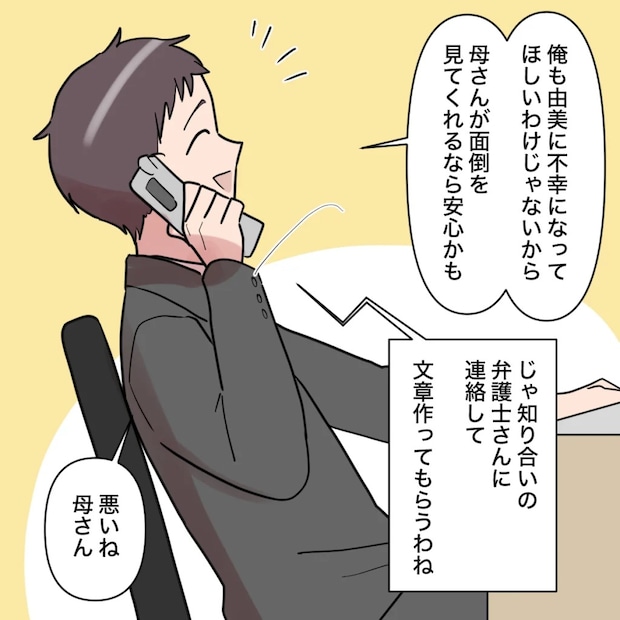 「俺も由美に不幸になってほしいわけじゃないから、母さんが面倒を見てくれるなら安心かも」そう言って笑う渉に、私は強い嫌悪感を覚えました。由美ちゃんに不幸になってほしくないなら、なんで不倫なんてしたの?そう責め立てたい気持ちを抑えて、「じゃ、知り合いの弁護士さんに連絡して文章作ってもらうわね」と冷静に伝えました。