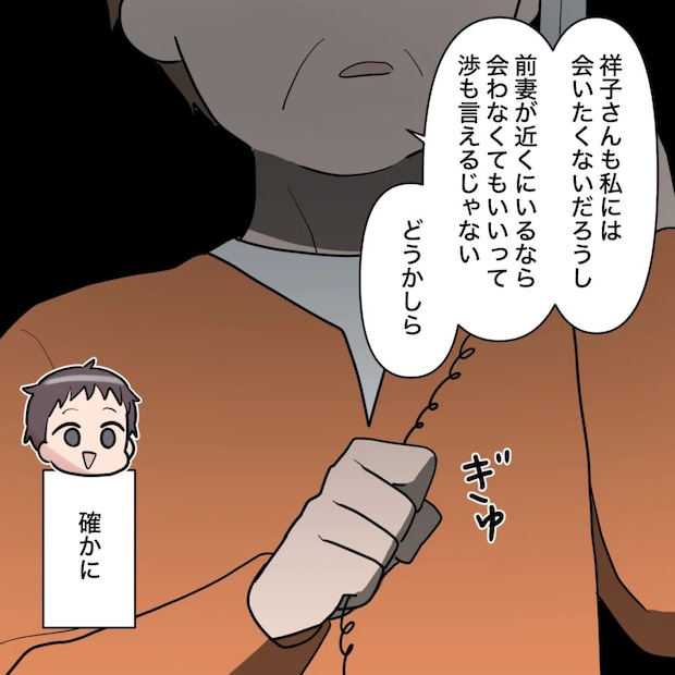 「祥子さんも私には会いたくないだろうし、前妻が近くにいるなら会わなくてもいいって渉も言えるじゃない、どうかしら?」私がそう言うと、渉は嬉しそうに「確かに」と頷きました。