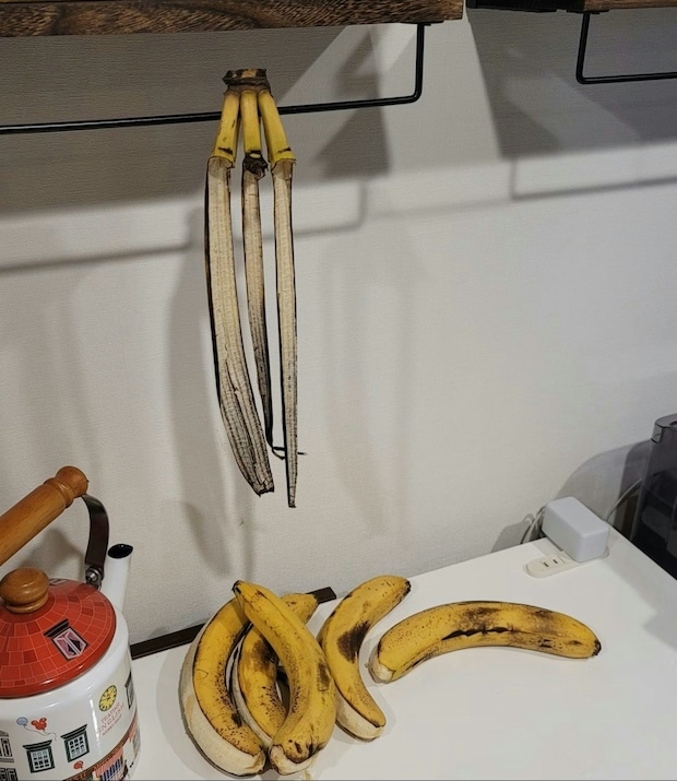 朝起きたら、つるしていたはずのバナナが脱皮してバラバラに。朝一番にこの状況を見たら何事かと驚いてしまいますし、よく全部脱皮したものだなぁ…と面白く感じますね。バナナの中身はおいしそうな色で、食べごろなのかもしれません。