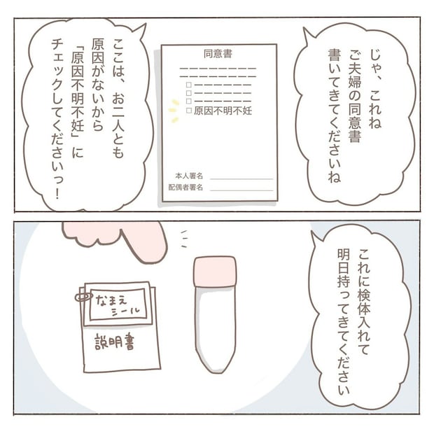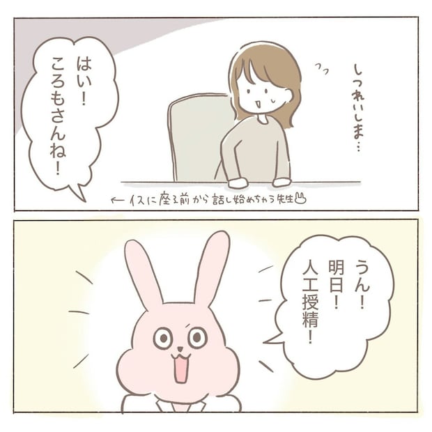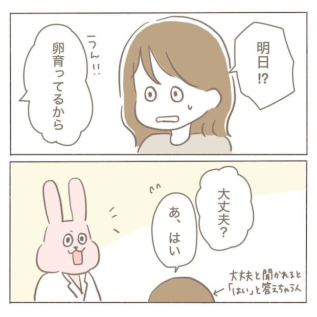 内診の結果を確認した先生は、部屋に入ると「明日、人工授精!」と告げました。あまりに突然のことで頭が追いつかず、coromoさんは思わず勢いで「はい…!」と返事をしてしまいます。