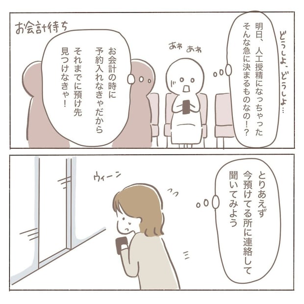 診察室に入ると先生からいきなり「明日人工授精!」と言われてしまいます。coromoさんの頭は娘さんの預け先のことで頭がいっぱいです。預かってくれるところは見つかるのでしょうか。