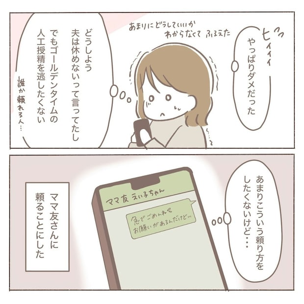 急に「明日、人工授精」と言われても、娘さんの預け先が決まらなければ喜べる状況ではありません。不安で胸がざわつく中、あまり個人的な事情で頼りたくなかったママ友に、思い切って助けを求めることにしたのでした。