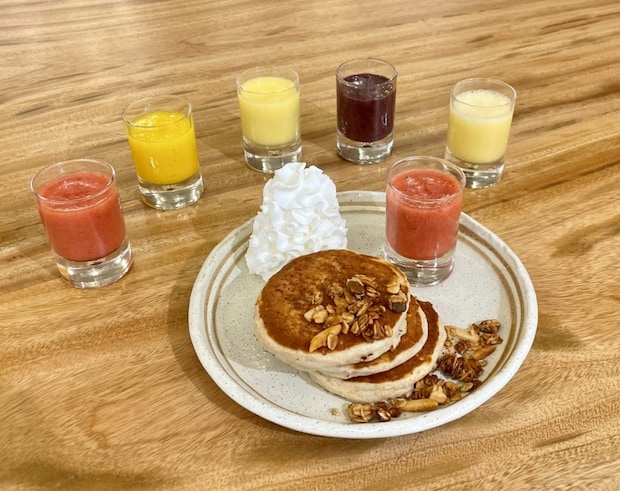 注文を受けてからブレンダーで仕上げるフルーツソースをかけて楽しむパンケーキ
