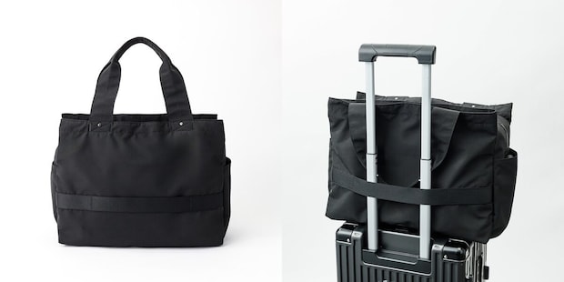 背面に、キャリーケース用ベルトを配置。メイン収納はファスナーで閉まるため、移動中も安心して持ち運べます。サブバッグとして旅行のお供に。