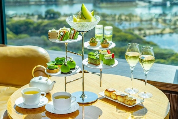 鮮やかな緑色が美しく映えるスイーツ&セイボリー。初夏の陽射しにきらめく東京湾を眺めながら、心癒されるティータイムを。