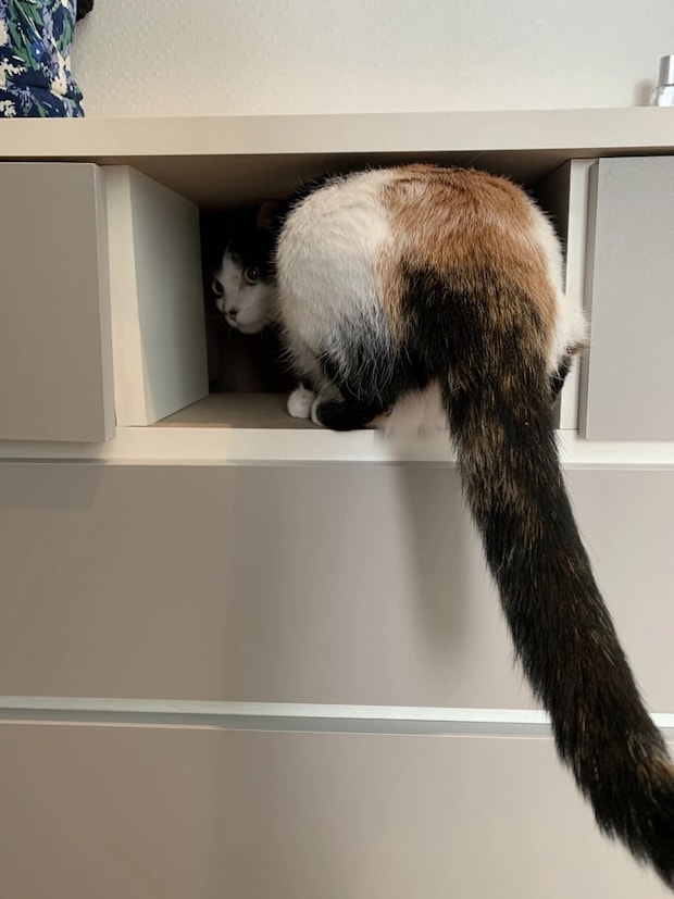 実は、飼い主さんが棚の片付けをするために引き出しを抜いたところ、突如現れた空間を見逃さなかったにゃんこ達。「入る」という行動に出たわけですね。しかし、金時ボデイにはちょいとスペースが足りずという結果に。