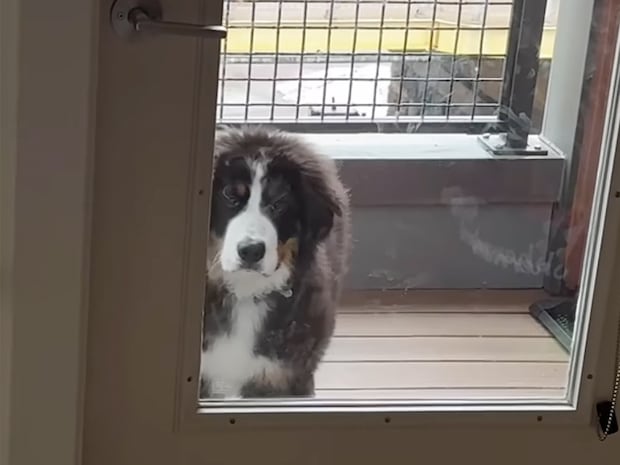 窓越しにじーっとこちらを覗き込む一匹の子犬さん。