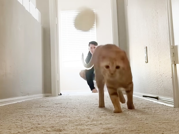 廊下の端で飼い主がキャップをパチンと弾けば、