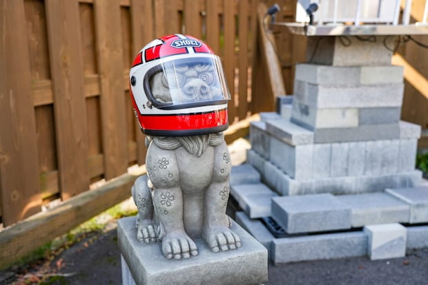 どうやってかぶったんだろう、と思うほど、ぴったりサイズのヘルメットをかぶった狛犬。