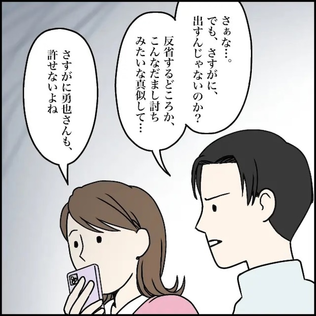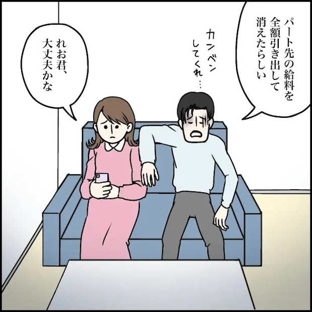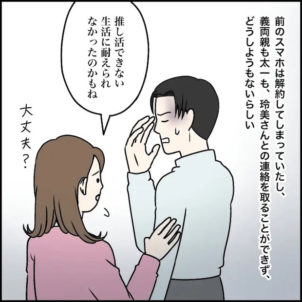 連絡を取ろうにも、以前使っていたスマホはすでに解約済み。義両親も太一も、玲美さんと一切連絡が取れず、なすすべがない状況でした。私は太一に、「大丈夫?きっと推し活できない生活に耐えられなかったのかもね」と優しく声をかけます。