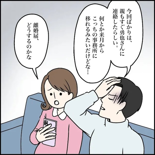 「今回ばかりは親もすぐ勇也さんに連絡したらしい、何とか来月からこっちの事務所に移れるみたいだけどな・・・」そう言って頭を抱える太一に、私は「離婚届、どうするのかな」とたずねます。
