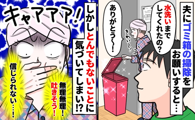 燃えるゴミ用のゴミ箱が汚かったので、夫に時間があるときに拭いてほしいと頼みました。すると夫の仕事が休みのある日、私がパートから帰ると、ゴミ箱がとてもきれいになっていたのです!私は夫に感謝の気持ちを伝えました。しかしその後、信じられない事実が判明し……。