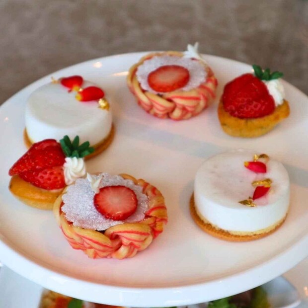 運ばれてきたティースタンドの上段には、旬のいちごを活かしたスイーツが美しく並んでいます。赤と白のコントラストが印象的で、添えられたエディブルフラワーや金箔でさらに華やかに。いちごの甘い香りがほんのりと漂い、これから始まるティータイムへの期待が高まります。
