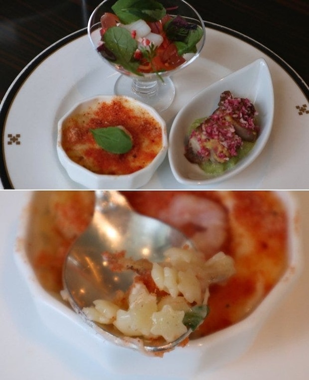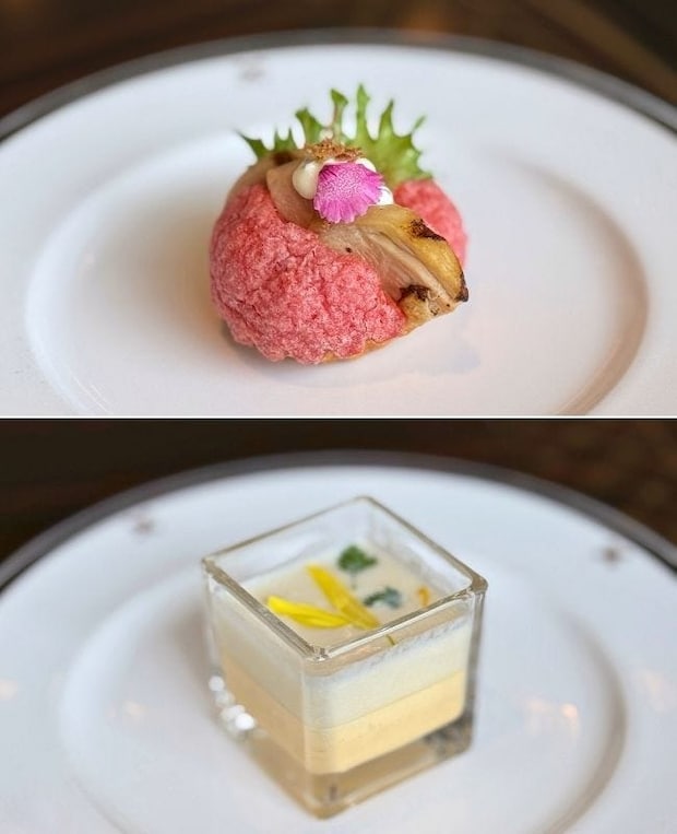 「筍のフランと白アスパラガスの冷製スープ」は、和出汁をベースにした筍のフランに白アスパラガスのスープを重ねた2層仕立て。筍のシャキシャキとした食感、白アスパラガスのほのかな甘みが、春の訪れを感じさせてくれます。茶碗蒸しのようなやさしい味わいで、スイーツの合間にいただくのもおすすめ。