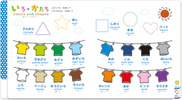 本の後半にある「いろ・かたち」のページは思わず手がとまる代表例。カラフルに並んだ「いろ」のTシャツと、空に浮かぶいろんな「かたち」の雲に、こどもはじ〜っ! 集中している姿に、大人もうれしくなる瞬間