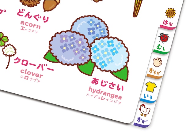 ページの右端にあるインデックスは、小さなこどもの手でもめくりやすく、好きなページにすぐいくことができるという、『こどもずかん』ならではのアイディア。ページをめくる姿を見て、感動するママパパも!
