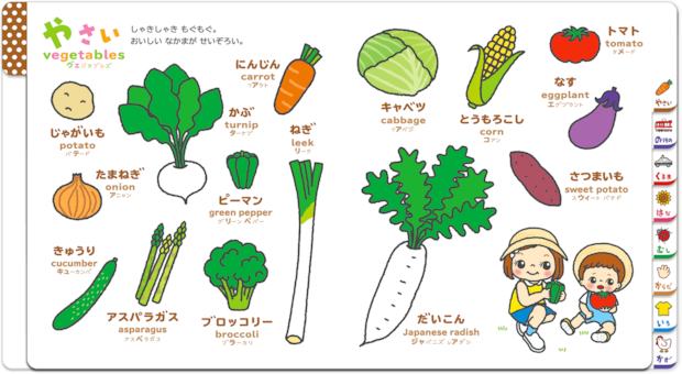 上から順に「やさい」「からだ」のページ。大小のサイズバランスや配置、色づかいが絶妙。ページ内で見るべき順番が自然に伝わってくるから、ストレスなく目を通していける
