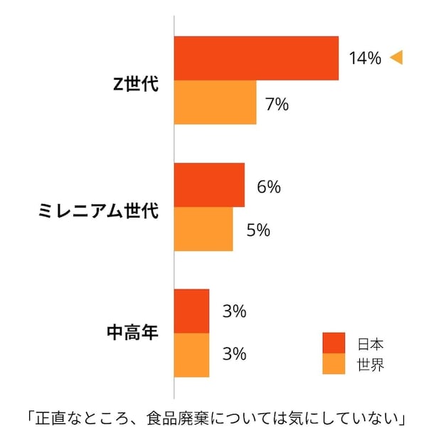 日本では、食品廃棄について世代が上げるほど意識が高くなることがわかりました(「食品廃棄を意識していない」と回答した人:Z世代14%、ミレニアム世代6%、中高年層3%)。