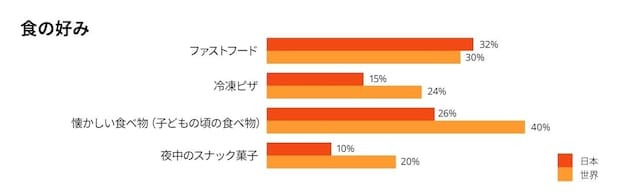 世界では日本と比べて「スナック(塩味)」や「子どものころに食べていた料理」を好む傾向が強いことがわかりました。一方50%の日本の人が甘いものが好きと回答し、世界平均よりも多いことがわかりました。
