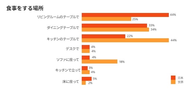 主な食事場所について、日本では「リビングルームのテーブル」で食べる人が44%と最多でした。一方、世界では「キッチンのテーブル」で食べる人が44%と最も多く、食事空間の中心が異なっていることがわかりました。