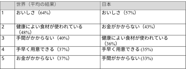 調査結果より、夕食選びにおいて「おいしさ」は世界共通の最重要項目である一方、日本では経済性、海外では健康や利便性といった価値観の違いが表れていることが明らかになりました。