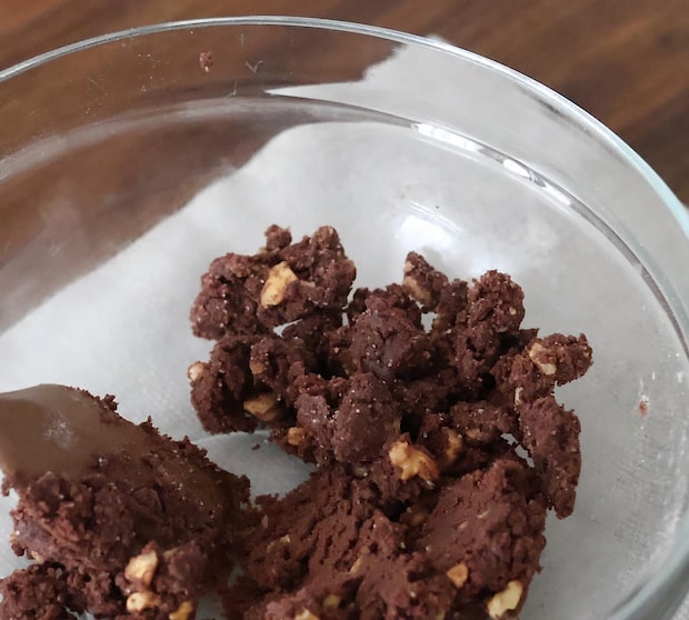 2. 1にA、砂糖、くるみを入れ、ゴムベラで生地を一つにまとめる。