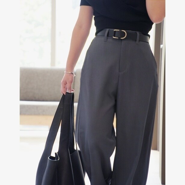にーよんさんの正解コーデは、「股上が深めのハンサムパンツ」を主役にしたスタイル。ポイントは、お腹やお尻をトップスで隠すのではなく、パンツの中に収めてしまうこと! 股上が深いパンツをウエストの一番細い位置で履くことで、下腹をカバーしつつ「細い部分」だけを強調。