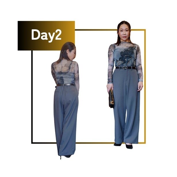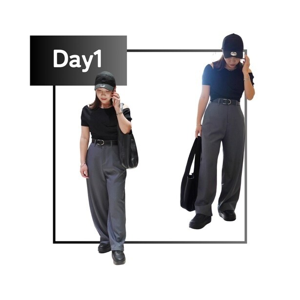 パンツ以外のアイテムをすべて黒で統一。重くなりすぎないよう、肩を少し出したトップスなどで「抜け感」を出すのがポイントです。黒の引き締め効果と、グレーパンツのきちんと感が合わさり、クールでスタイリッシュな印象に。