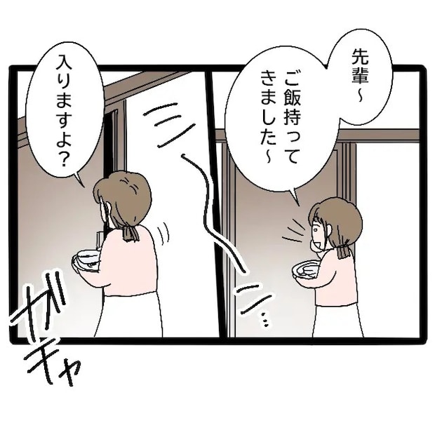みずほ先輩の部屋のドアをコンコンとノックし、「先輩~ご飯持ってきました~」と声をかけます。しかし返事はありません。まだ眠っているのかもしれないと思いましたが、せっかくなら温かいうちにご飯を食べてほしい。そう思った私は、「入りますよ?」と声をかけて部屋に入りました。