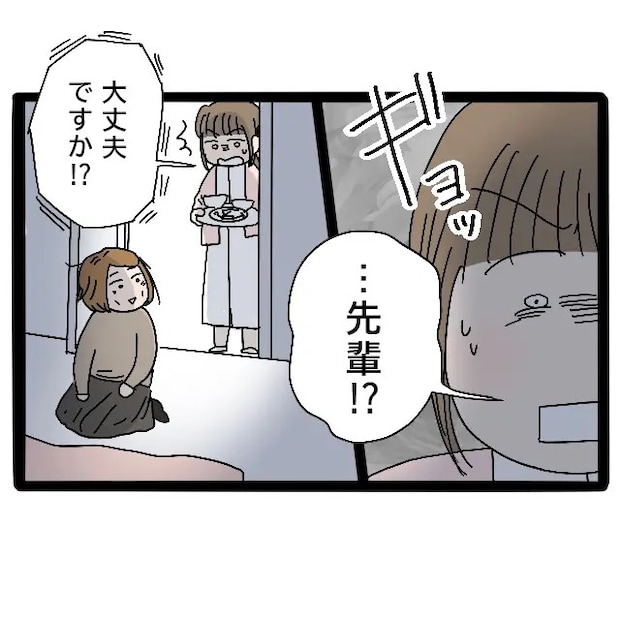 ドアを開けると、真っ暗な部屋で眠っているつむちゃんと、そのそばで座るみずほ先輩の姿がありました。私に気づいたみずほ先輩は、「あっ、カオリ・・・」と消え入りそうな声でつぶやきます。