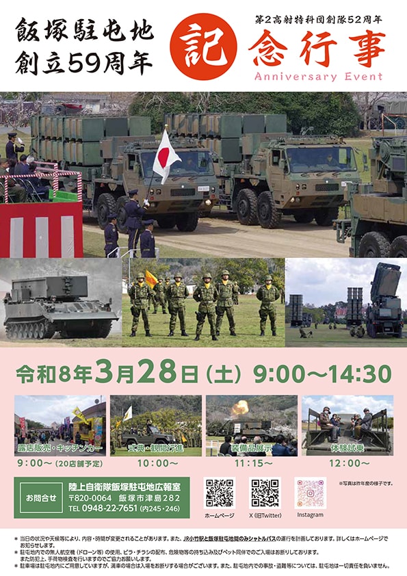 ★当日の状況や天候等により、内容や時間が変更されることがあります。 ★詳しくは飯塚駐屯地ホームページ、公式X、インスタグラムをご確認ください。