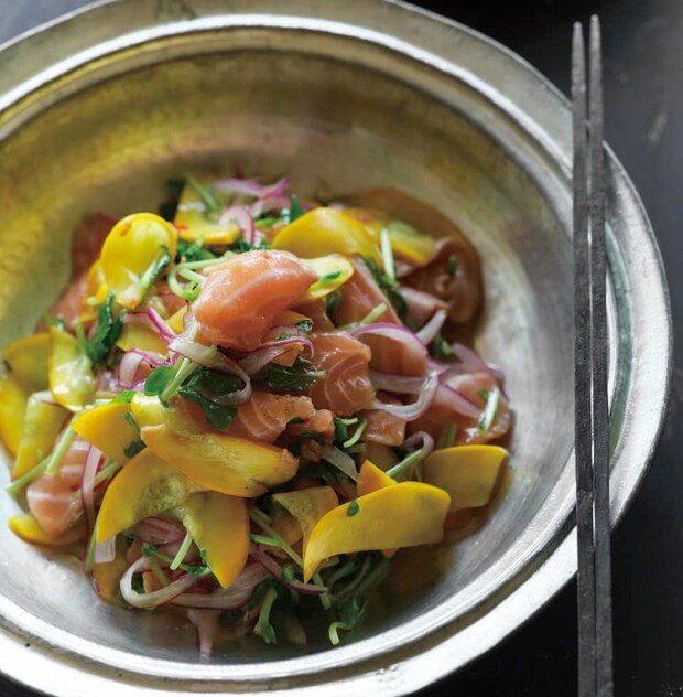 甘辛いスイートチリソースとコクのあるナンプラーで調味し、食欲をそそるタイ風の和え物へ。脂がのったサーモンも美味!