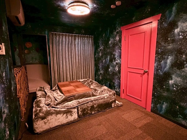 壁面デザインや空間設計にもこだわり、子どもたちが物語の世界に入り込んだような体験を提供。こたつを備えたくつろぎスペースも設置されており、大人がリラックスしながら見守れる環境が整っている。