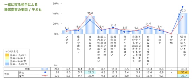 具体的な睡眠阻害の要因は、「寝相の悪さ」が3割半ばで最も高く、「自分の寝る場所が狭い」「起床時間・就寝時間の違い」などが続きました。
