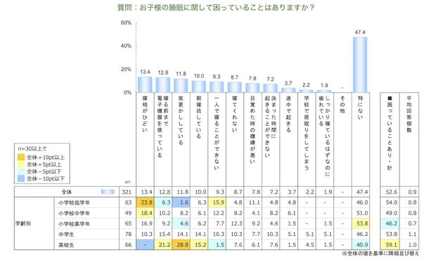 さらに、寝る前に「勉強」をしている子どもは、学齢別では中学1-2年生、高校1-2年生で割合が高い傾向がみられました。「スマホ」や「ゲーム」と同じく、「勉強」もアプリやタブレット教材を使用する機会が増えたことにより、睡眠環境に影響を及ぼしている可能性があります。